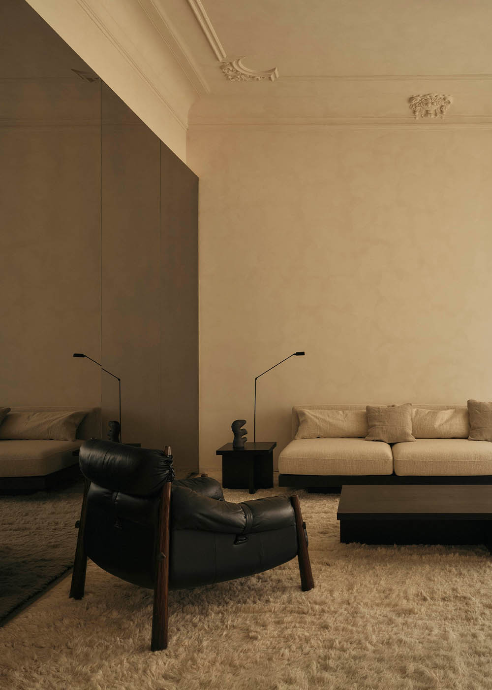 The furniture reinforces this timeless narrative. Together with the owners, true design enthusiasts, a carefully curated selection of vintage pieces from Nekonato Gallery has been arranged, featuring works by Percival Lafer, Sergio Rodrigues, and Alvar Aalto, which engage in dialogue with contemporary designs by Vincent Van Duysen and Viabizzuno.