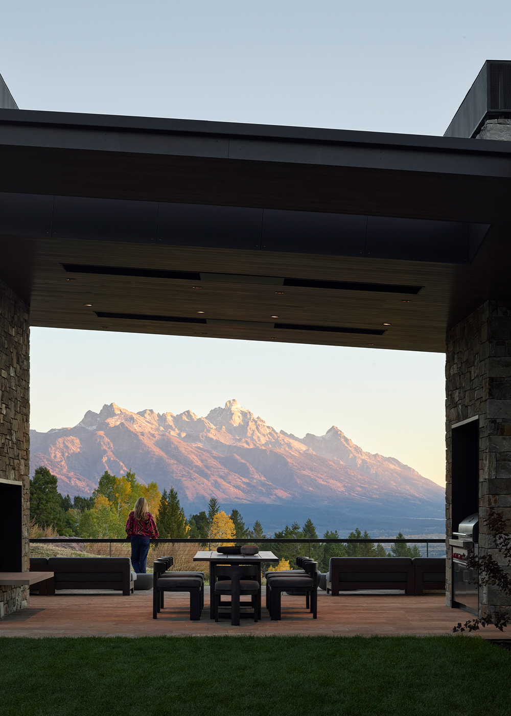The home occupies a prominent 49-acre / 20-hectare lot perched on the eastern crest of a butte. With panoramic views of the Teton Range to the north and Sheep Mountain to the east, the site has a dramatic sense of elevation and openness that evokes the feeling of floating in the sky. The steep contours and sloping terrain informed the home’s orientation, while local height restrictions led to a design that anchors into the hillside, with the slope closely informing the elevation of the structure.