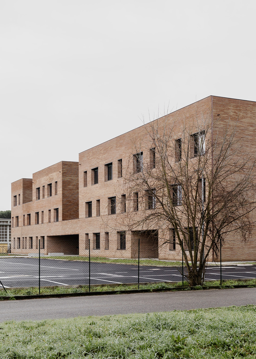 Another fundamental aspect is materiality. The choice of brick was driven by the desire to establish a connection with the surrounding context. As a continuous and highly tactile element, brick emphasizes the volumetric composition of the building, clearly translating floor plan variations into volumetric changes.