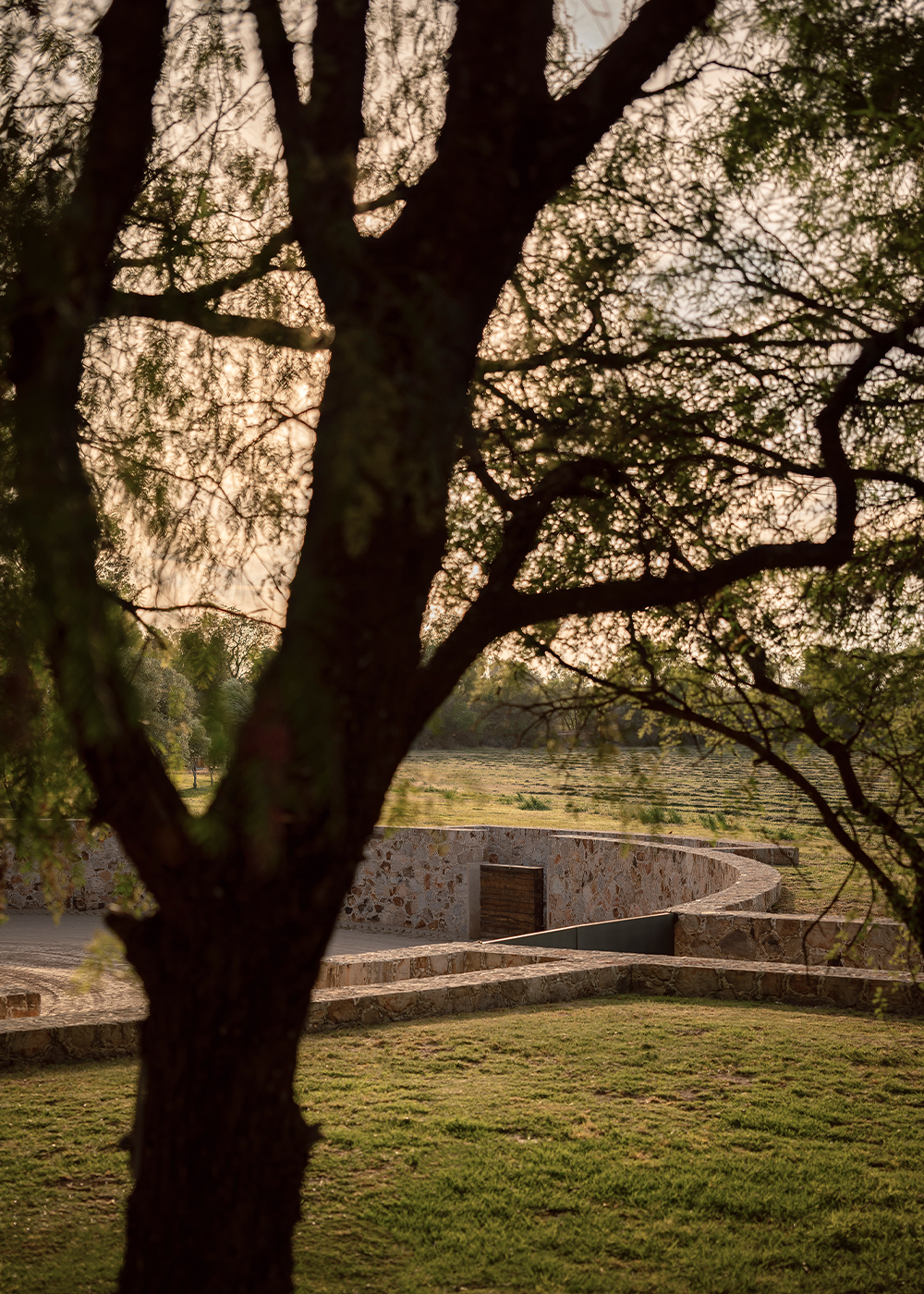 Access to the ring is via a staircase that descends following the curve of the arena. This path passes through a tunnel designed to protect two old mesquite trees and leads to a semi-sunken courtyard shaded by them, with a small fountain that provides freshness and a moment of pause. From there, one enters the breeders' box, where the tienta is directed. This space features a large window that frames the wall of the ring in the foreground and, in the background, the monumental silhouette of the Peña de Bernal. On one side, there is a discreet wine cellar, and on the other, access to the main burladero and the ring.