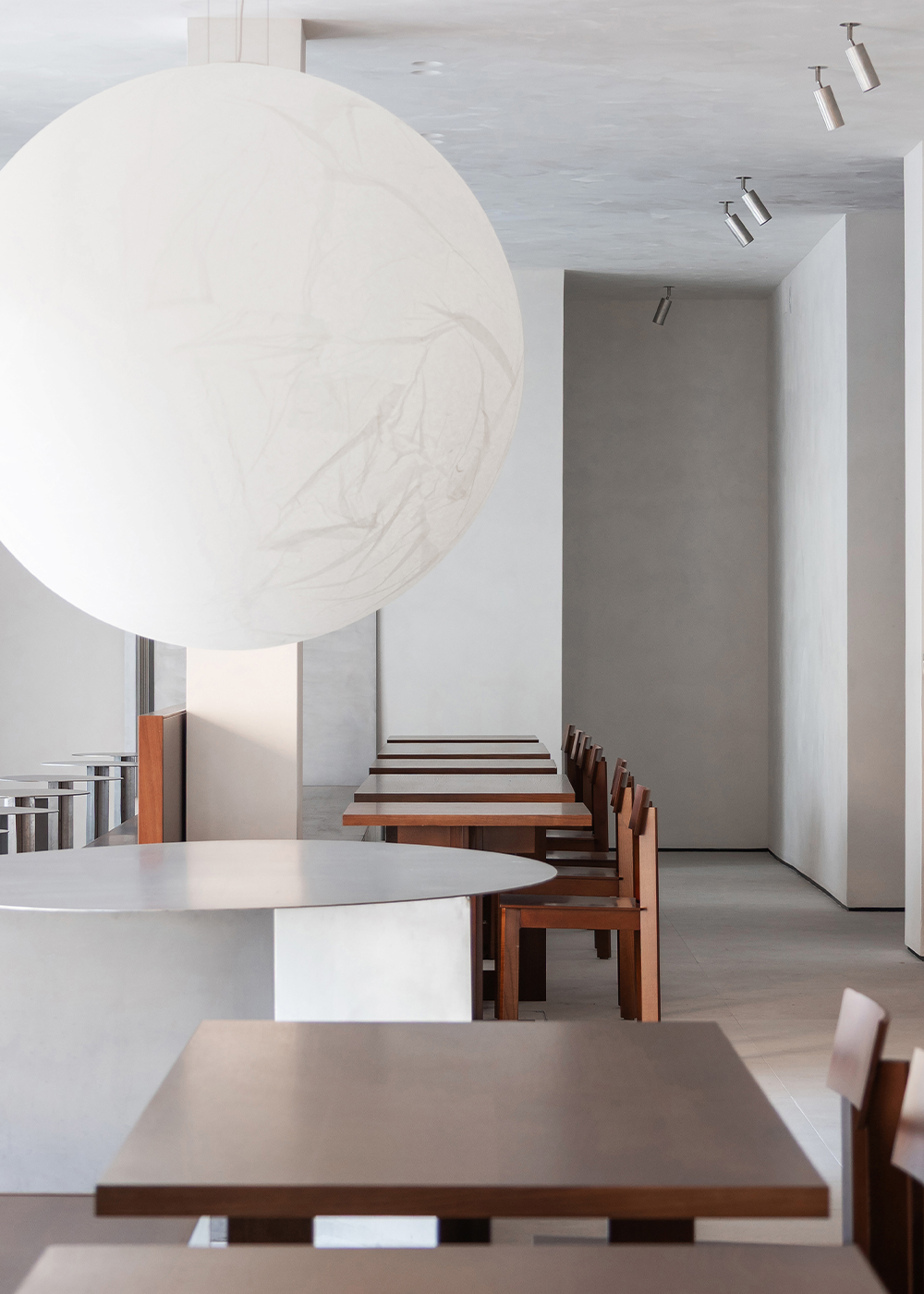 The system creates new seating areas on both sides, establishing two distinct zones: one with smaller tables intended for circulation and shorter stays, and another designed for longer periods of use and more relaxed occupation.