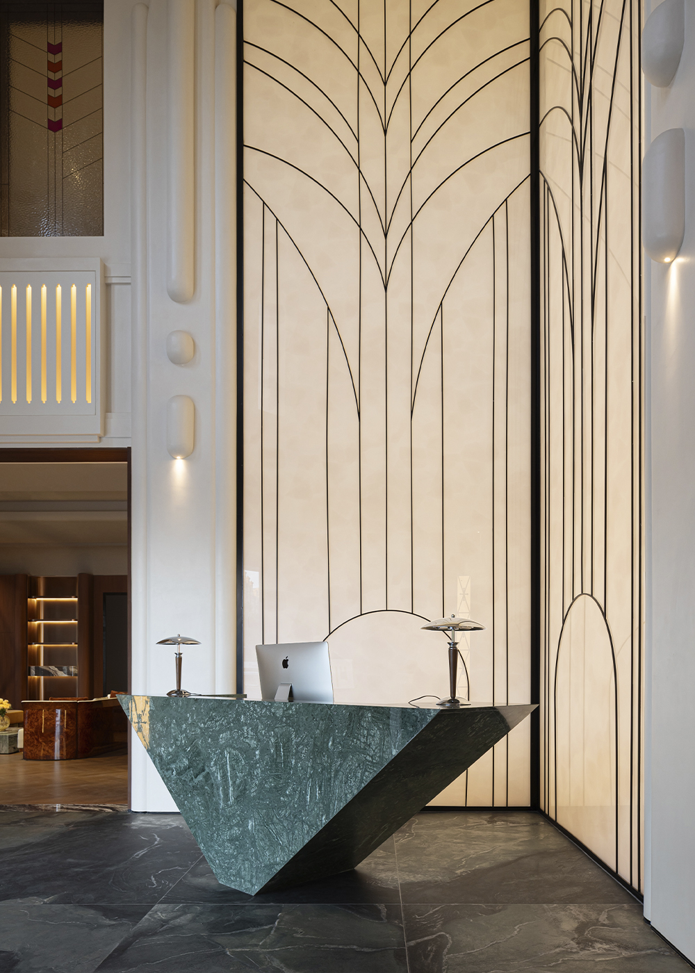 The vaulted lobby opens with an Art Deco screen in black and gold. A dark green marble reception desk meets the gray stone floor. The lounge radiates fluid ease, where sunlight filters through louvers onto a velvet sofa and marble table.