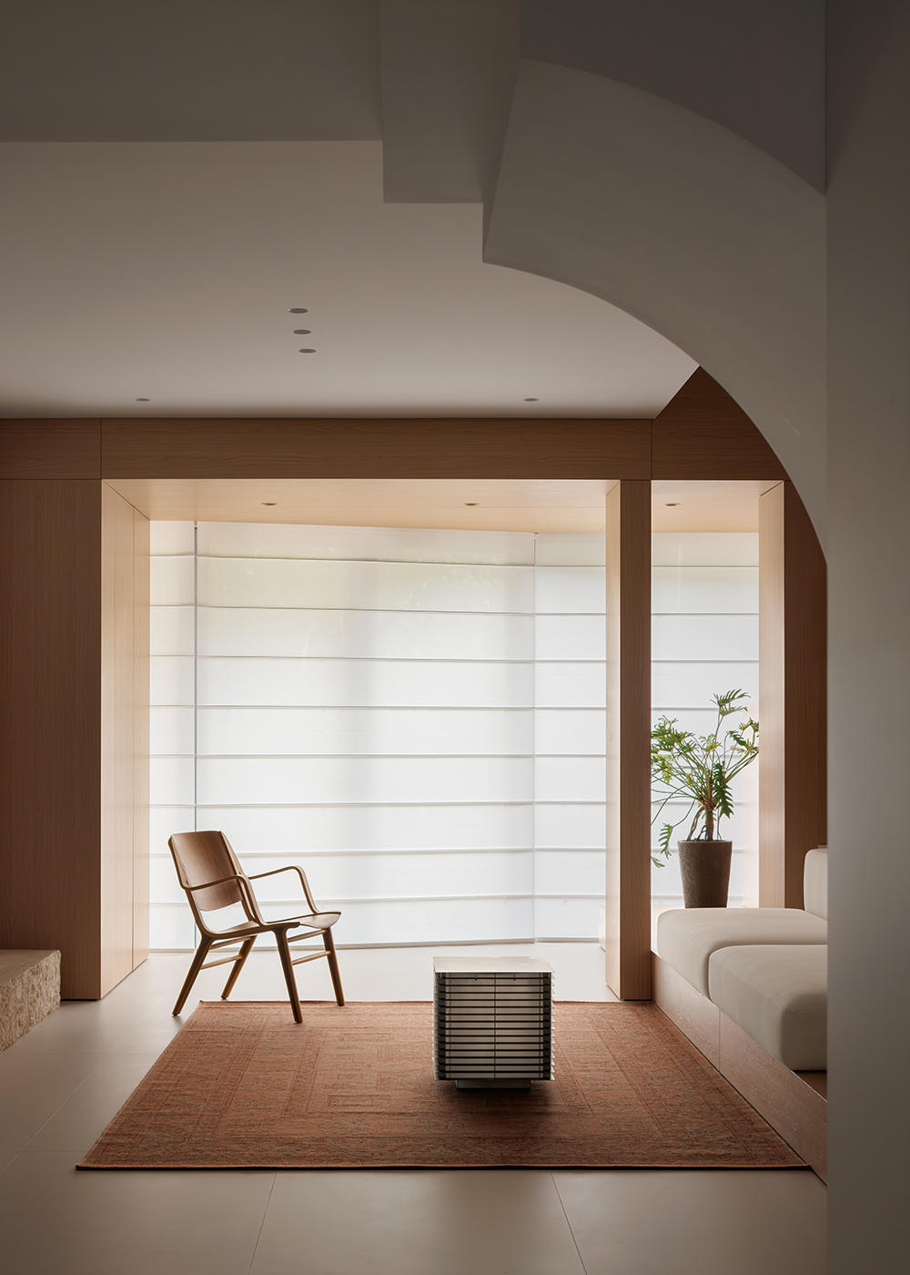 After the walls of the dining room were removed, the space was reorganized, forming a smooth interactive loop with the living room and kitchen. This allows family members' movements and gazes to intertwine freely, integrating the isolated act of dining into the ongoing family narrative. Travertine is used as the dominant material, applied to the custom dining table and the open grid system on the walls, creating visual continuity and a tactile warmth from the horizontal to the vertical planes. The same texture extends and echoes in different dimensions.