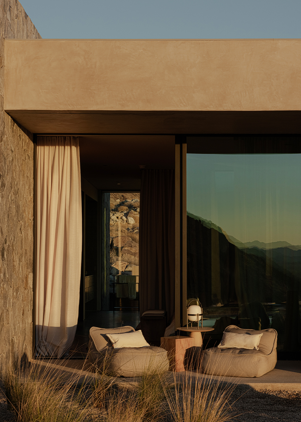 From within, the design extends this connection to the environment through a palette of sober, tactile materials: limestone, textured natural-finish woods, patinated metal, and smooth walls with mineral-based finishes in earthy tones. The chromatic range —ochres, soft greys, coppery accents— responds to the desert light, shifting the perception of the space throughout the day.