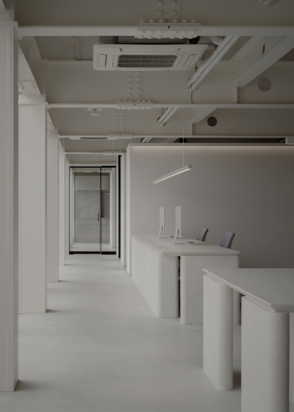 The desk layout was planned as a translation of the building’s latent spatial potential into a new mode of working. Conversations arise naturally with just a slight turn of the body, flowing seamlessly into shared discussions over documents or monitor screens. Rather than defining meeting rooms as separate enclosures, the space embraces the continuity of movement, creating an environment where communication remains light and fluid.