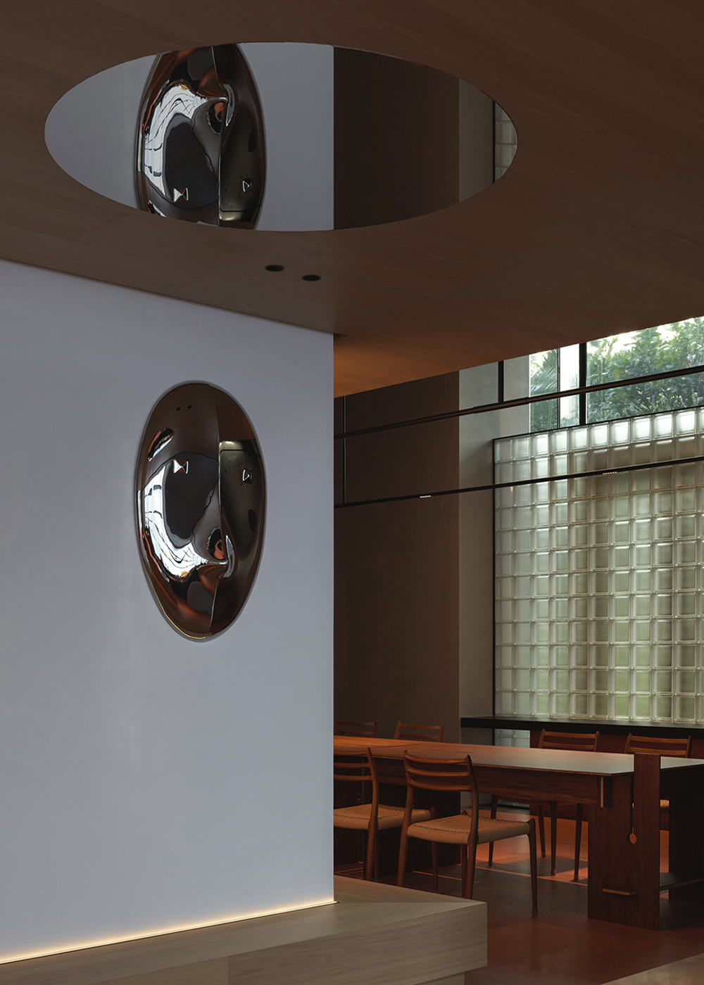 With the concept of mass at its core, this serves as the pivot point connecting two levels of the space. The black, floating texture of the surface tells a story through the craftsmanship of a puzzle, while the 'carved hand' layers the thick wall, revealing small openings that subtly expose the inner structure. The interplay of light and shadow under the deep light creates an invisible tension, adding a sense of rawness.