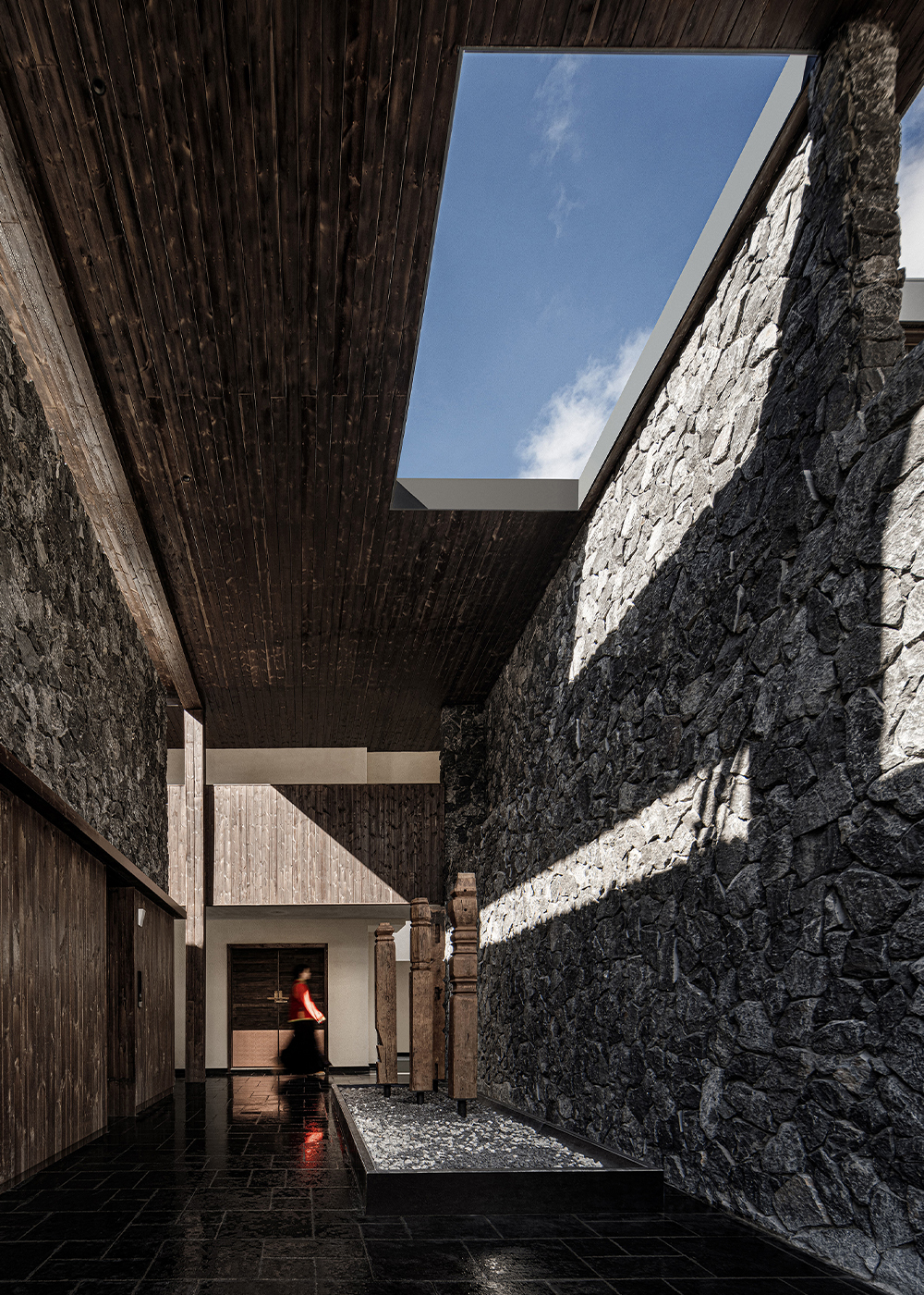 Fire was originally regarded as a microcosm of the sun. In other ancient civilizations, the sacred flame was always initially placed in a specific area before gradually being embraced by the living spaces of households. In Tibetan regions, daily life similarly revolves around the hearth. For Tibetans, fire is both material and spiritual—providing warmth and light. Here, the sunken hearth is emphasized by the space, creating a sense of cozy intimacy. The slightly dimmed surrounding light, the dancing flames within the hearth, and the crackling sound of burning wood all aim to offer a humanistic dimension that, while non-religious, still evokes spiritual resonance.
