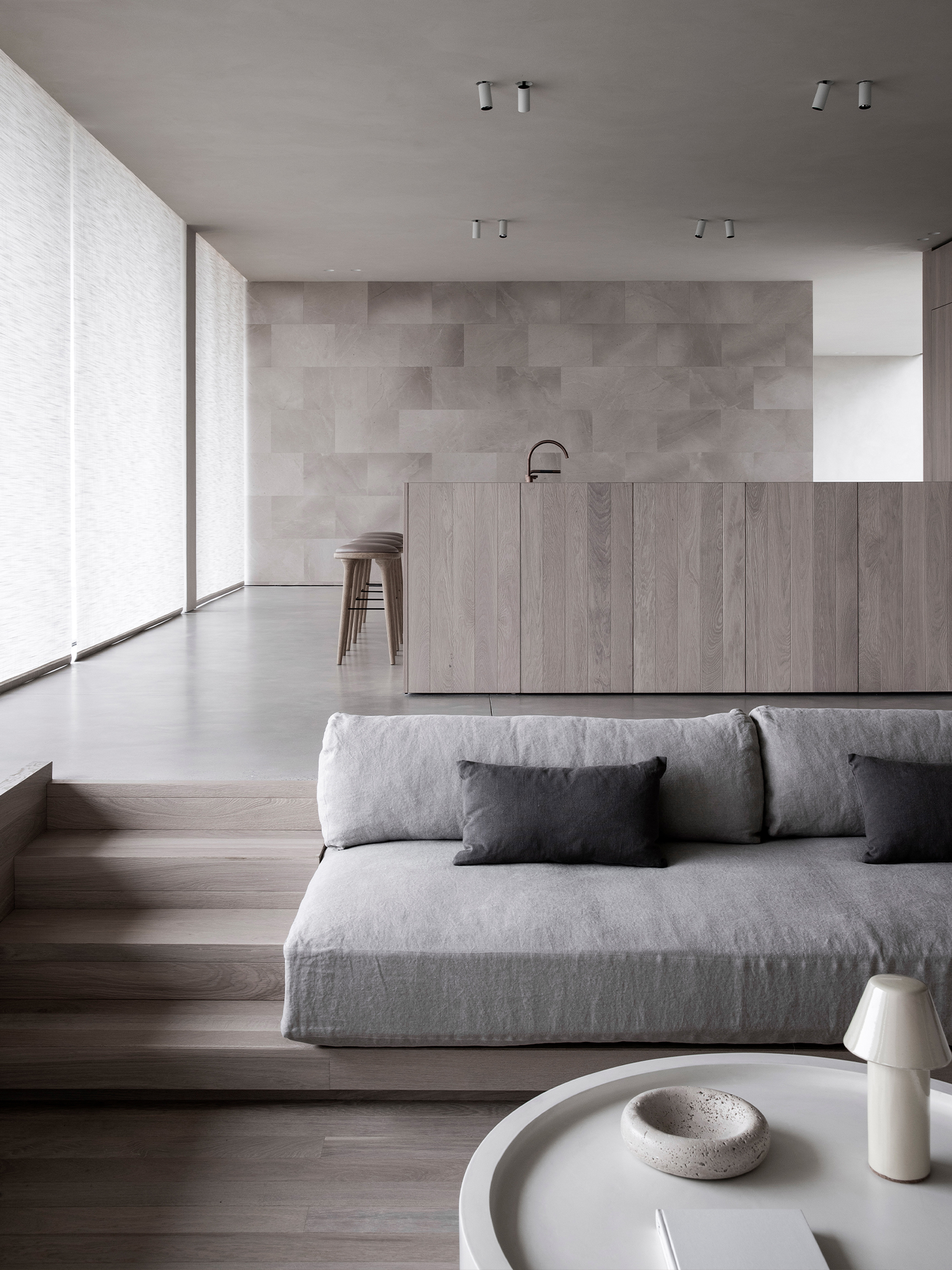 In order to ensure the consistency of the space, the dining room also uses custom oak tables and chairs, which are integrated in soft colors. Through the glass Windows, you can not only enjoy the natural scenery outside, but also reflect the balance between artistry, comfort and thoughtful design, resulting in a quiet and sophisticated living experience.Hand-crafted bleached oak serves as a link between the different Spaces, giving all functional areas their privacy and coherence. The clean and simple lounge area is combined with the soft and natural tones of the interior, adding rich layers of texture. Wooden tables are paired with comfortable upholstered furniture to create a calm and private living scene.