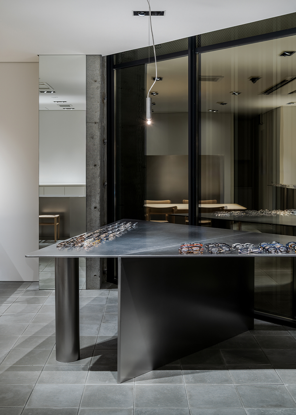 The original pendant lights were positioned along the same line as the architecture and furniture, adopting the same materials used for the display fixtures. Although the light itself is compact, suspending it by wire softens the relationship between the socket and the cord. By allowing the eyewear to blend seamlessly into the space, the store aims to create a place where each pair of glasses can be approached with care and attention.