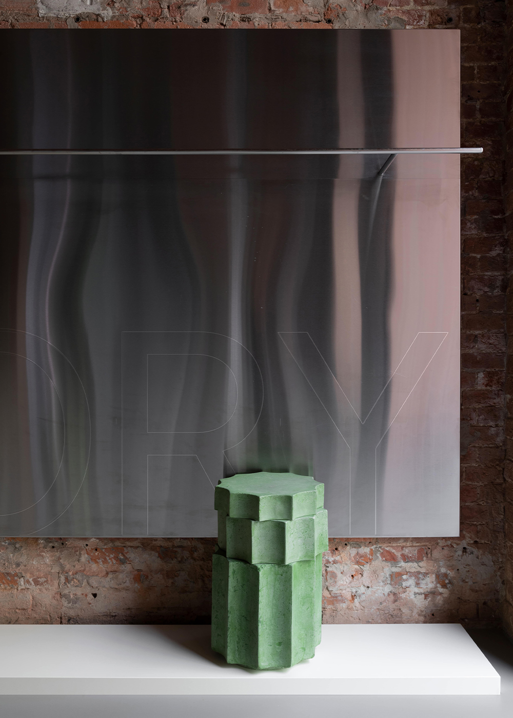 Stainless steel. As opposed to textured bricks, we went for clean technological and modern materials that add a contemporary and futuristic feel. Stainless steel with its reflective brushed surface and sophisticated bright green colour (repeated in natural onyx) - locally form separate functional areas.