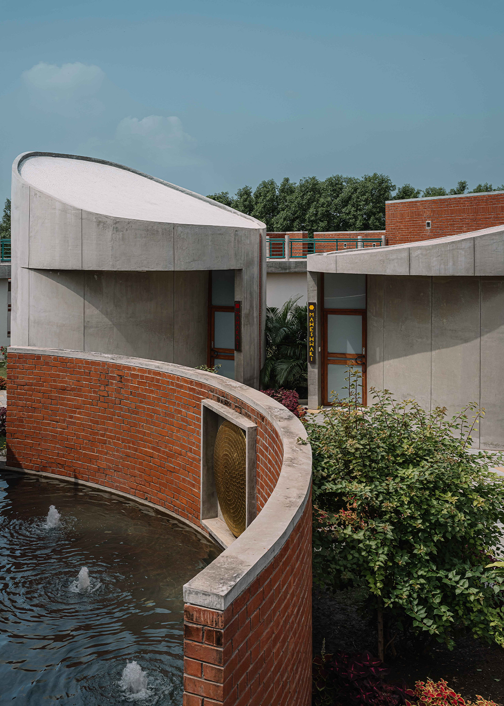 Mona Doctor-Pingel, a seasoned Auroville-based architect, has been involved in the project since 2010, incorporating 3 decades of experience. Her design integrates nature’s five elements, creating sensory narratives with courtyards, bio-ponds and a blend of brick, concrete, and glass. Sustainable practices, including rainwater harvesting and indigenous flora, ensure harmony with the low-lying site, while the built environment balances Ahmedabad’s and Chandigarh’s architectural sensibilities.