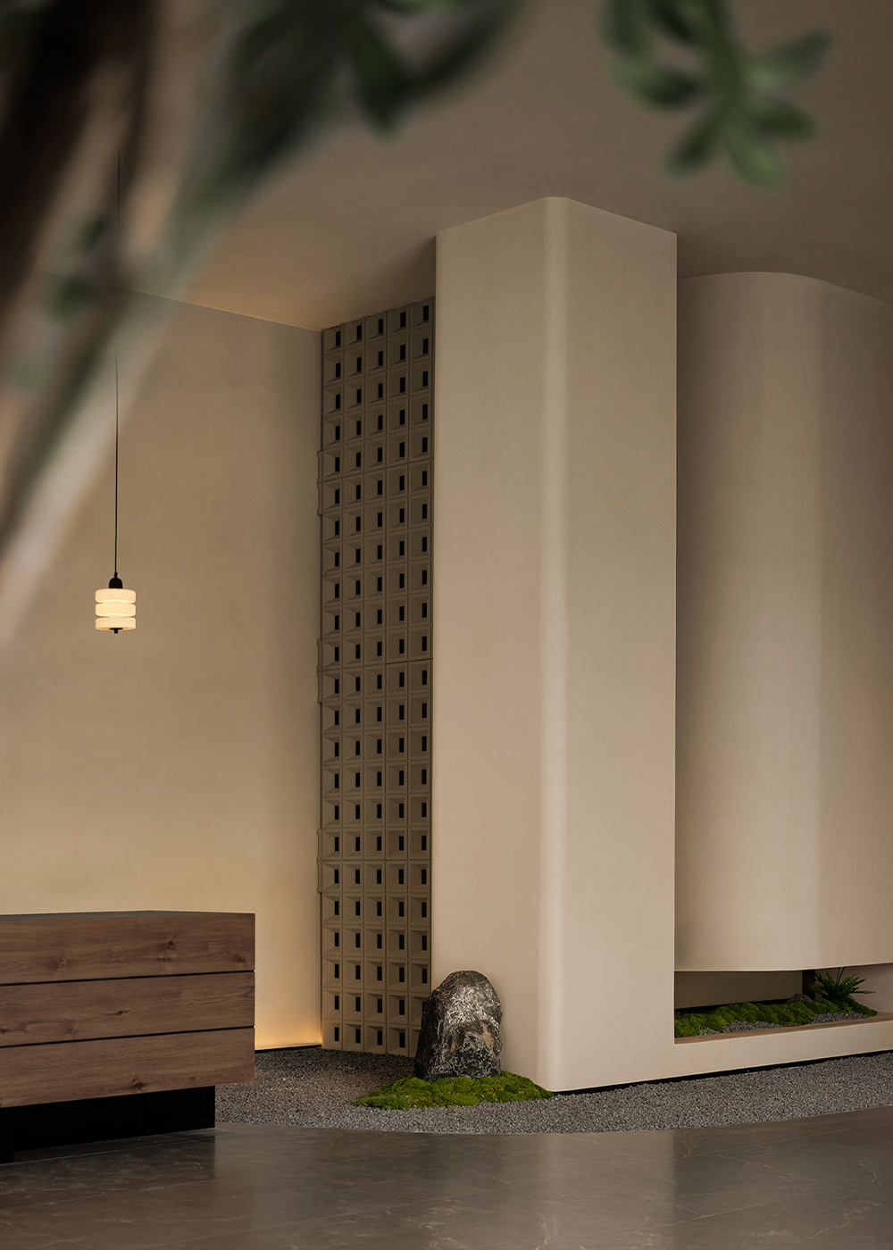 The reception desk conveys a sense of natural simplicity through the texture of raw wood grain and deep brown tones. The curved ceiling design forms the core of the light-and-shadow narrative, where warm light softly diffuses to create flowing bands of illumination, guiding the visitor’s gaze. Small landscape inserts and architectural volumes introduce rhythmic variations, prompting guests to slow down and enter a state of quietude.