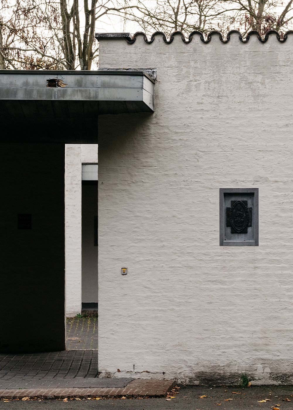 The initial encounter with the abbey is a statement of extreme simplicity. The massive brick walls are uniformly clad in rough, plain white plaster, rejecting any decorative reading. A thin, line-like roof of black glazed clay tiles precisely outlines the form, creating an elemental contrast with the white walls. The long façade, punctuated only by the entrance and a single small window on the distant second floor, exhibits a profound restraint.