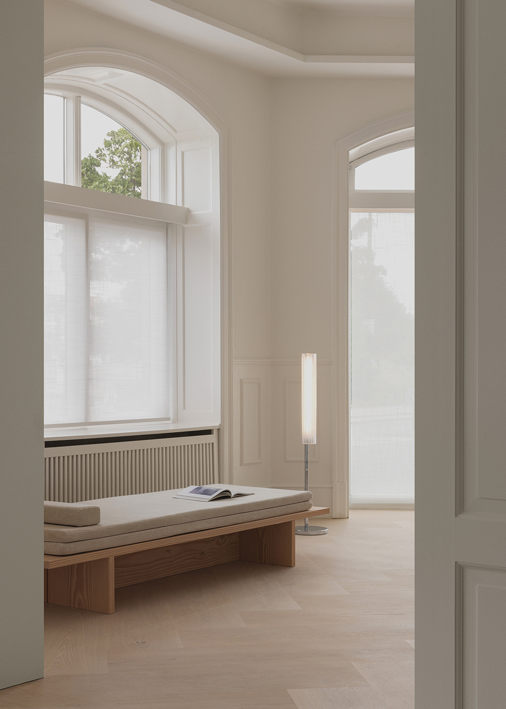 This friendship, one that has mutually enhanced both parties, has lasted for decades. To mark its 30th anniversary, Pawson and Dinesen collaborated on the Dinesen Apartment. The apartment comprises a living room, a small study, a library, and a kitchen, forming a complete living space. The interior is simplified as much as possible, with white walls stripped of excessive ornamentation. The 11-metre-long plank flooring softens and blurs the spatial boundaries.