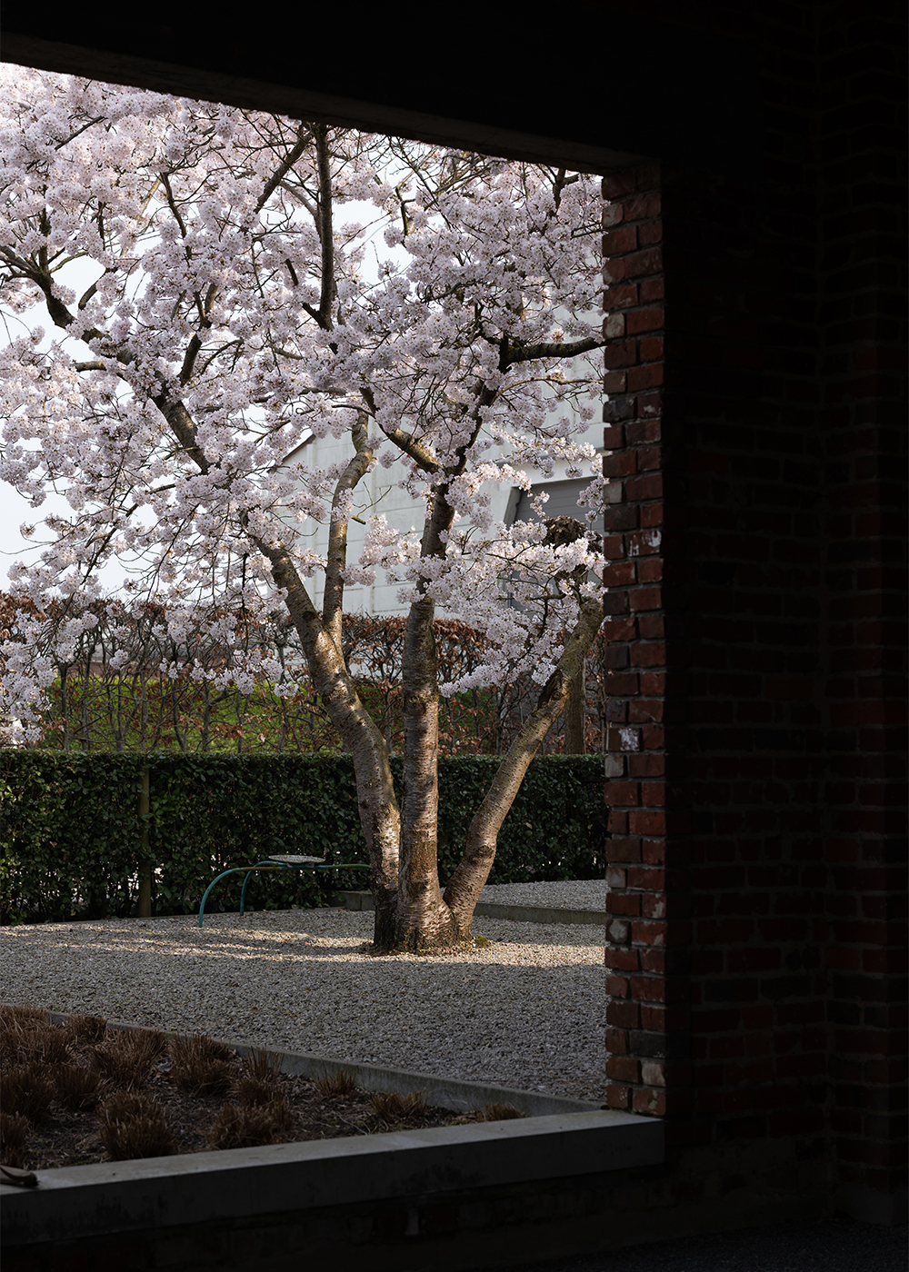 We wandered through the rest of the home-office hybrid, pausing at niches, sculptures, and soft light filtering across carefully selected materials. As we stepped back outside, the spring air was soft and the cherry trees were in full bloom — heavy with blossoms, their branches bowed under the weight. Frederic smiled and called it lucky timing. Nothing overdone, nothing out of place — just the right moment, in the right light.