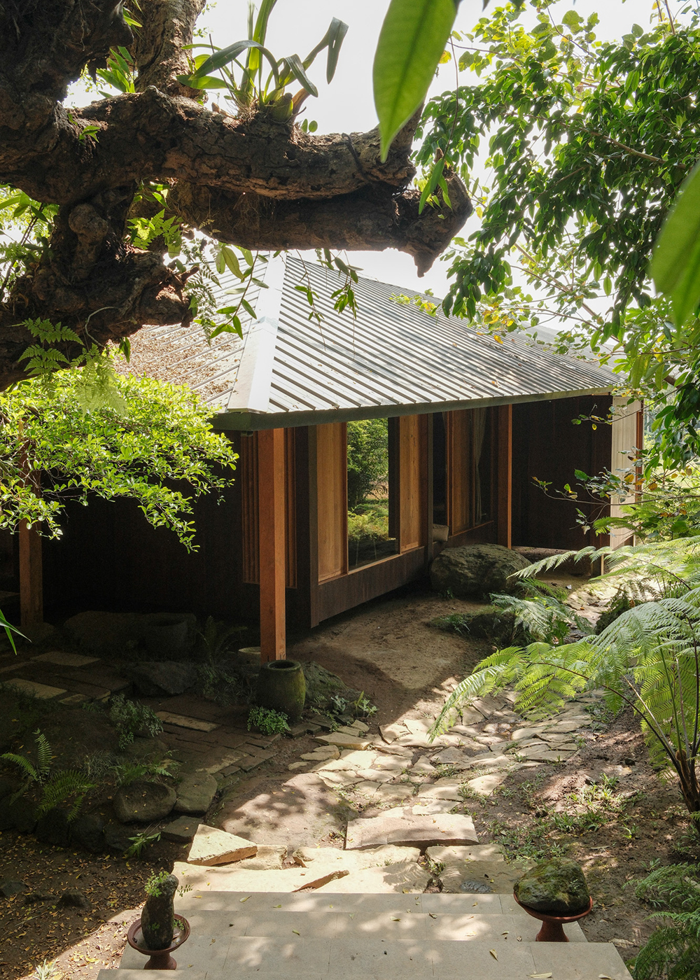 Material authenticity runs through the project: reclaimed ironwood on the façade fades to a moonlit gray; banana-fiber paper handmade by Japanese artisans forms a ceiling that seems to breathe with the light; river stones set into teak steps offer alternating warmth and coolness under bare feet.