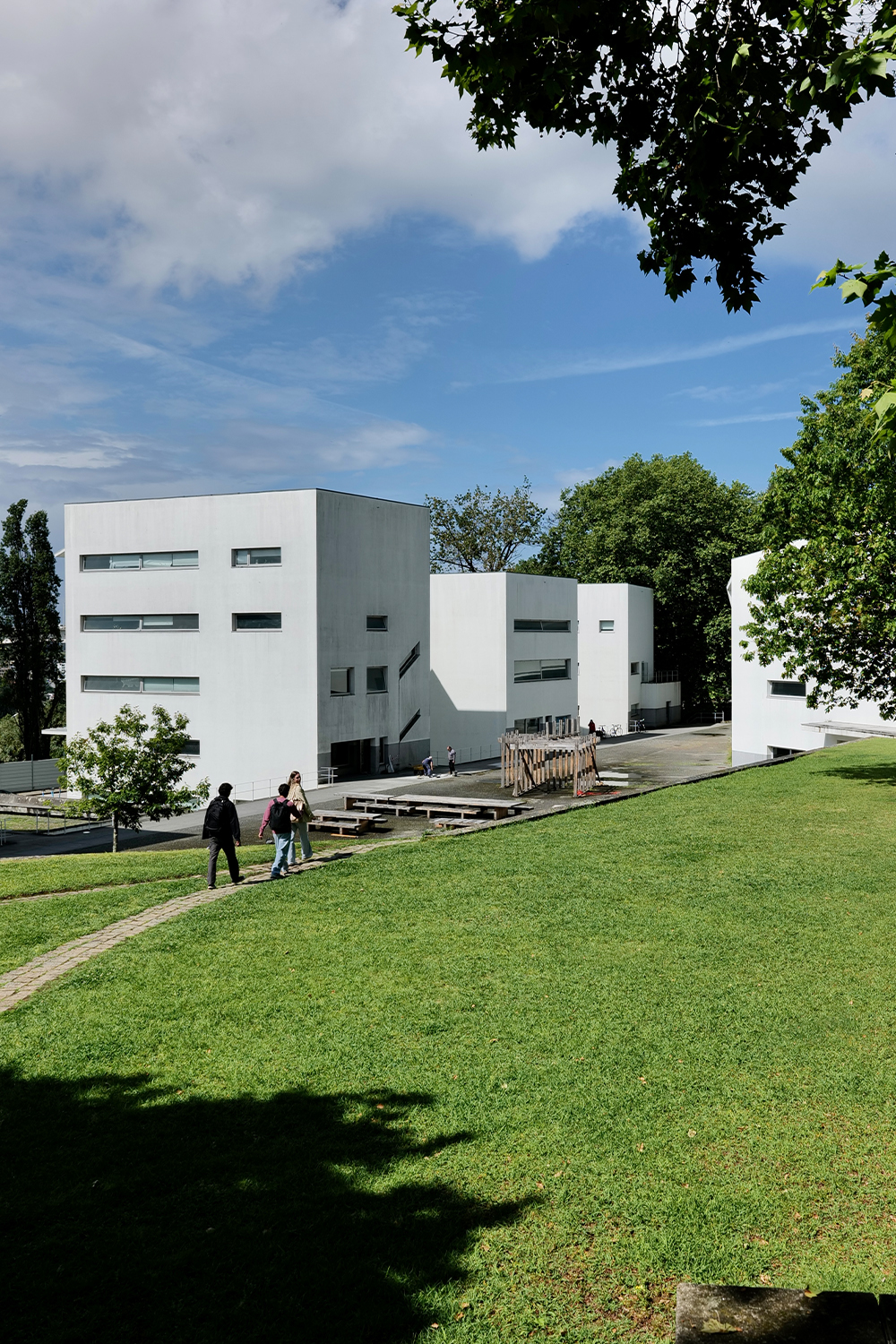 The Porto School of Architecture was constructed between 1985 and 1996. This building consists of 10 distinct volumes, each with its own unique character, but they share a common identity through color, opacity, and constructive solutions. Four towers are arranged along the river, while on the other side of the terrain, two buildings connected in a semi-circular shape occupy the central position. In the center of the site, an irregular, almost triangular large courtyard is placed, reminiscent of the shape of the first pavilion built by Álvaro Siza on the campus.