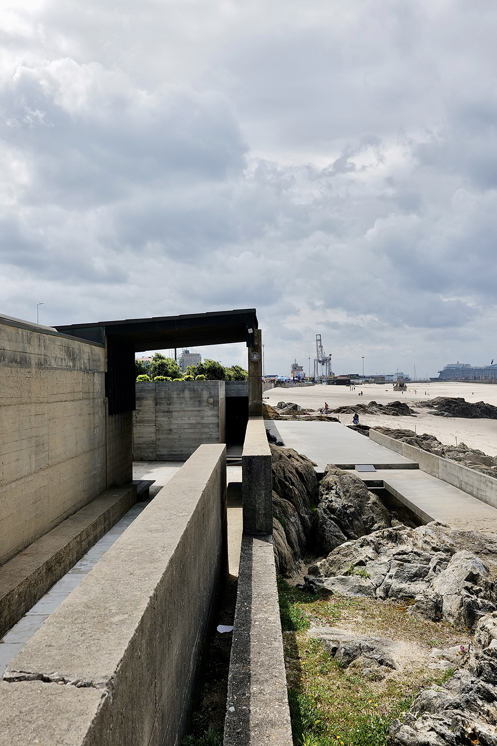 The Piscinas de Marés seaside swimming pools, designed by Alvaro Siza, make full use of the natural rock terrain and ingeniously embed the pools within it, blending seamlessly with the natural landscape of the Atlantic coastline. The building complex is arranged parallel to the coastal road and below the road level, preserving an open view from the road to the horizon. The access path to the pools features a gentle slope, gradually blocking external views and creating a sensory experience that transitions from sight to sound and back to sight.